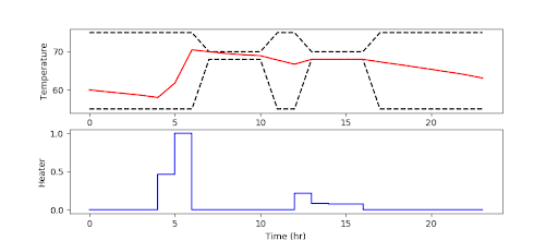 I'm trying to implement a thermostat control using MPC and GEKKO. The state variable (temperature) should be within a lower and upper pre-specified temp values , temp_low and temp_